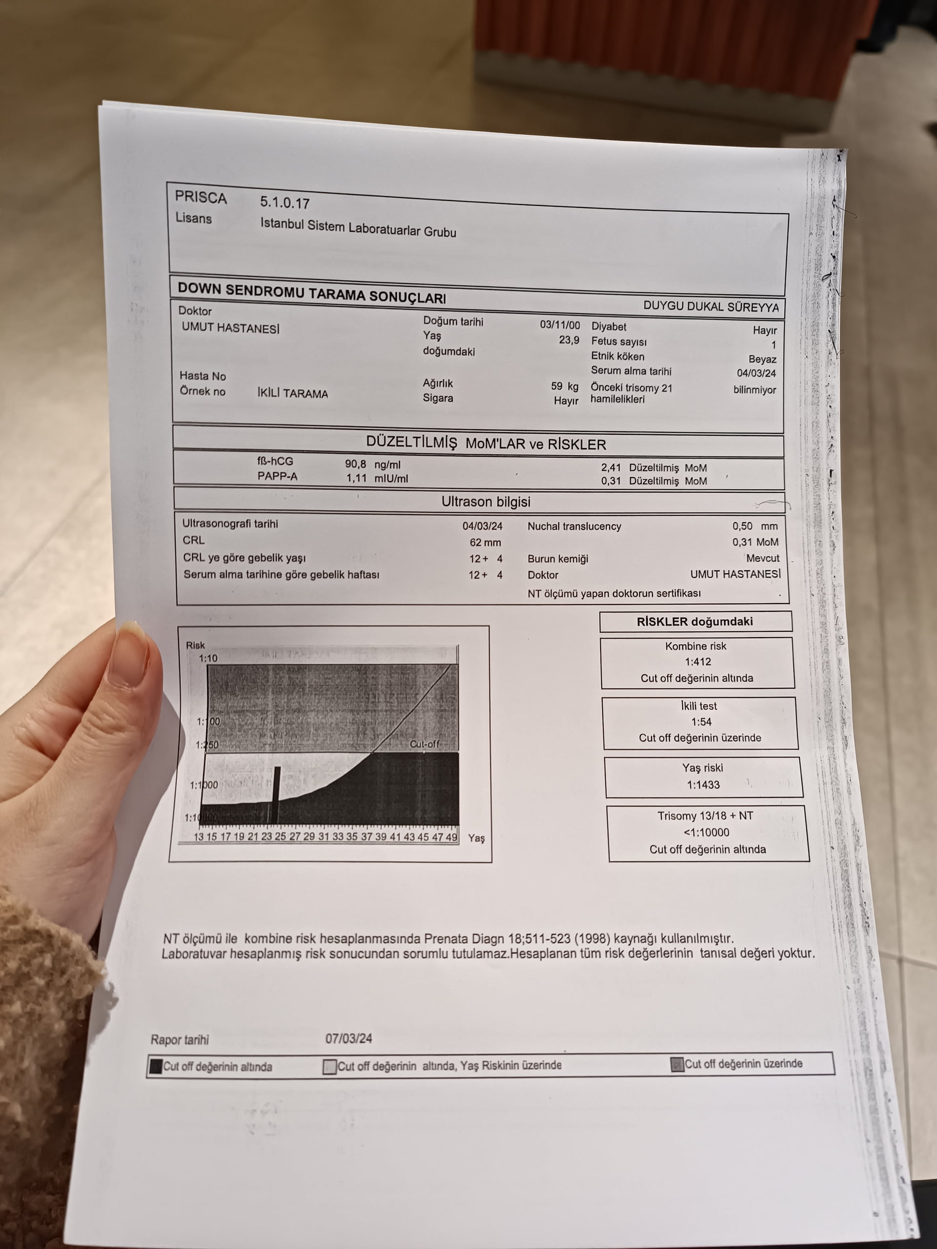 İyide 2li tarama testi kağıdınızda bi yazı var arkadaşlar bu değerler tanı amaçlı değildir,dünya çapında baz alınan değerlere oranla risk hesaplanır diyo… ve doğru sonuç oranı %70,-80 den fazla değil nipt doğru sonuç oranı %99.8 filan yani %0.2lik bi sapma payı var :))