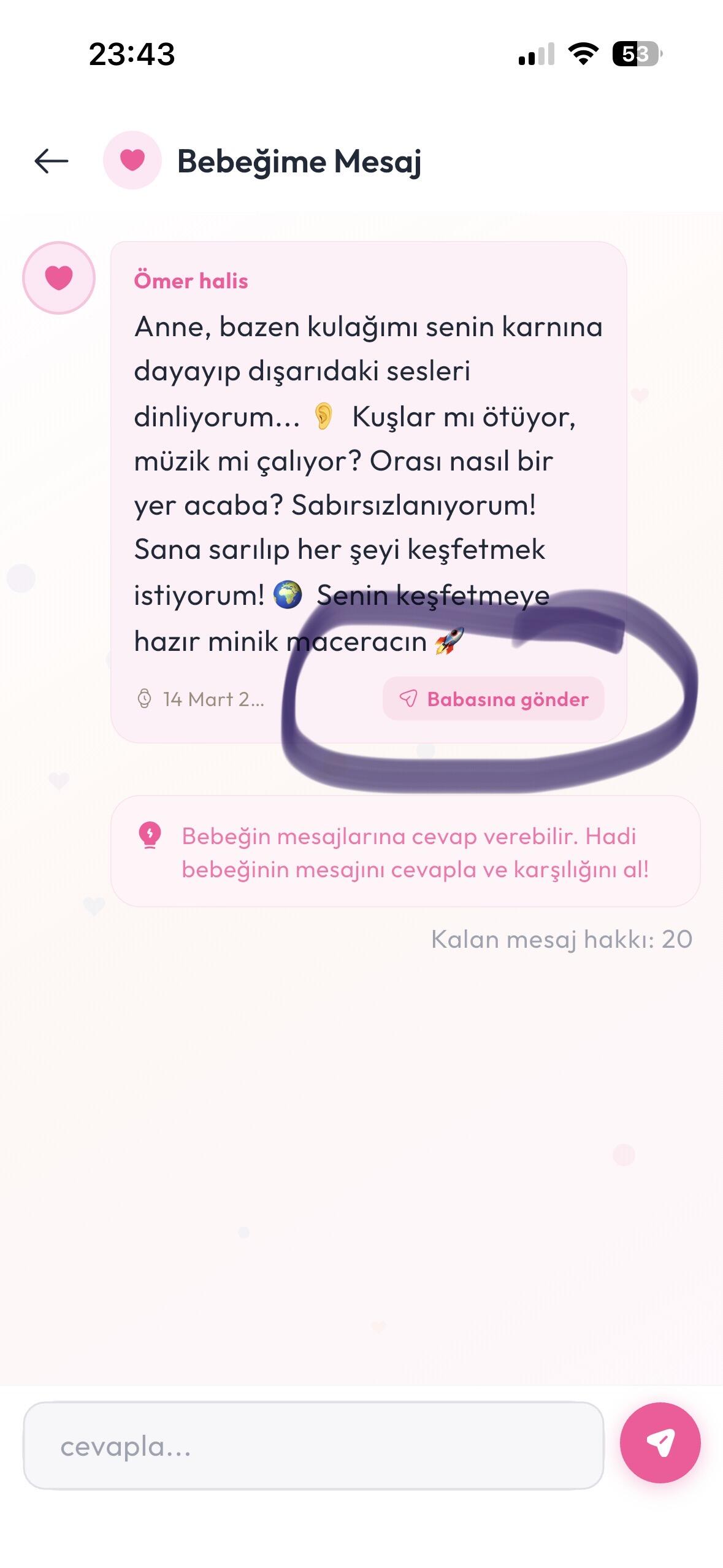 Kızlar son güncelleme ile birlikte babayı davet etme özelliği eklendi. Profil Ayarlar> Babayı Davet et ekranından alacağınız kodu eşinize gönderiyorsunuz. Eşinizde uygulamayı indiriyor ve Baba olarak giriş yap seçtikten sonra sizin verdiğiniz kodu girince baba da artık bebeğin gelişimini doğuma kalan süreyi gibi detayları görebiliyor.