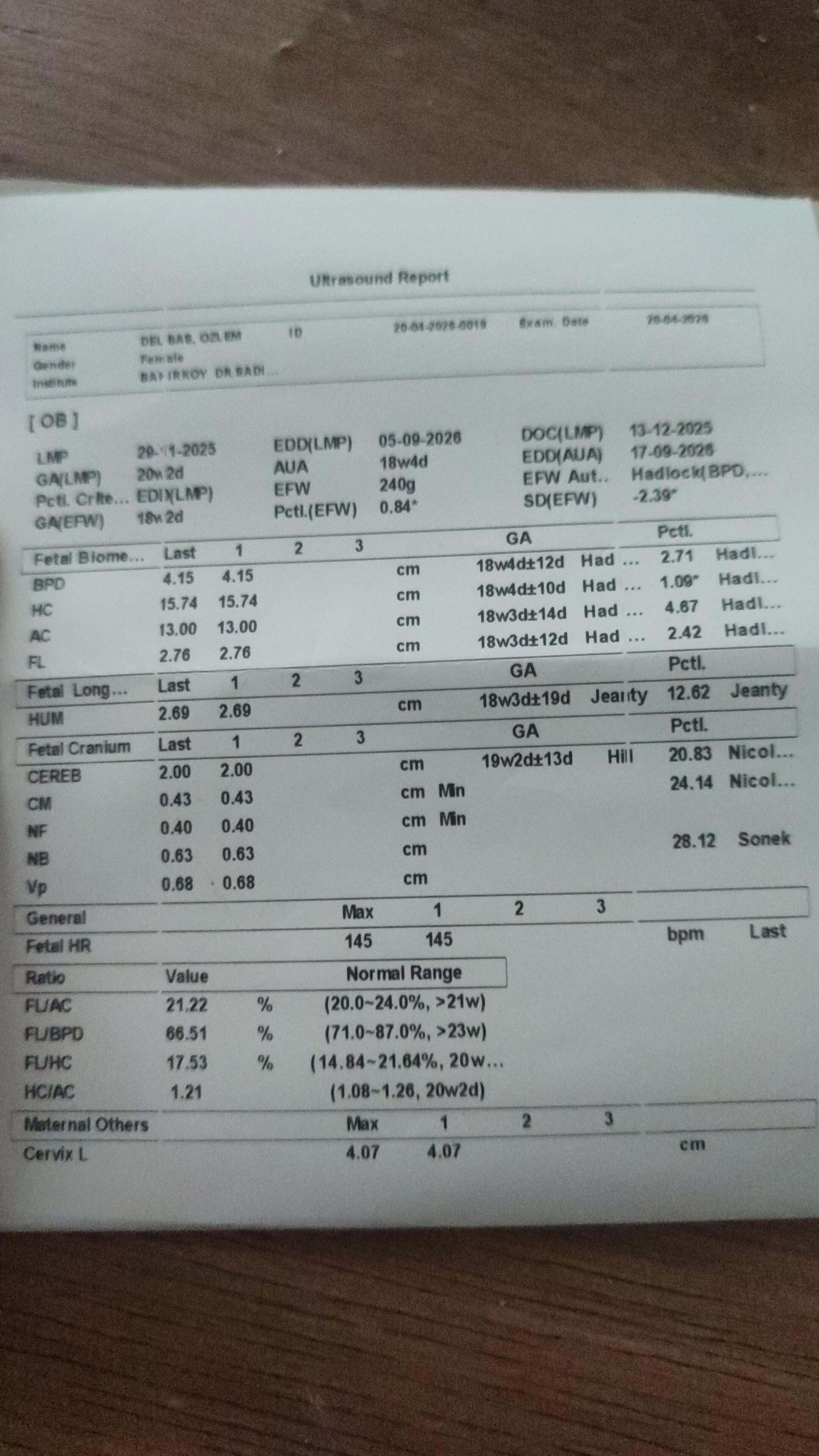 Beyin ölçüleri (cerebellum vs.) yazılmış ve normal sınırlar içinde görünüyor.